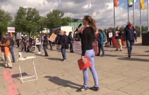 Eine Vertreterin der Hamburger Krankenhausbewegung auf der Kundgebung von DIDF. „Wir haben uns trotz Corona den 1. Mai nicht nehmen lassen! Auf verschiedenen Kundgebungen haben wir gemeinsam mit Vertretern aus den Krankenhäusern, den Gewerkschaften + anderen Gruppen unsere Forderungen laut gemacht. Wir kämpfen weiter!“ (DIDF-Jugend Hamburg)