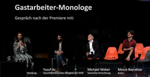 Gespräch nach der der Premiere am 25.11.21 Deutsches SchauSpielHaus Hamburg, mit: Michael Weber, Mesut Bayraktar (Autor), Yusuf As (Geschäftsführendes Mitglied der DIDF) und Dilan Baran (Vorsitzende DIDF Hamburg). mpz 2021 / 28 min / ansehen